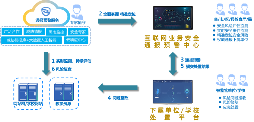 教育厅/局通过通报预警平台的监控管理实现众多分散业务的整体监控,通过大数据+人工智能进行预警预判,实时发现安全漏洞及安全事件,通过全闭环通报电子流及人工协助等手段,推动安全风险的提前解决和安全事件的及时发现,规避事件损失及影响。