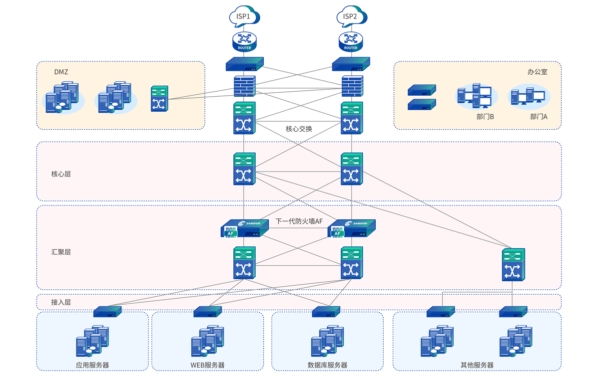 通过在在线业务服务器集群汇聚交换前部署深信服下一代防火墙AF,可实现业务系统服务器的逻辑隔离,防止来自网络层面、系统层面、应用层面以及数据层面的安全威胁在业务系统数据中心各区域内扩散。