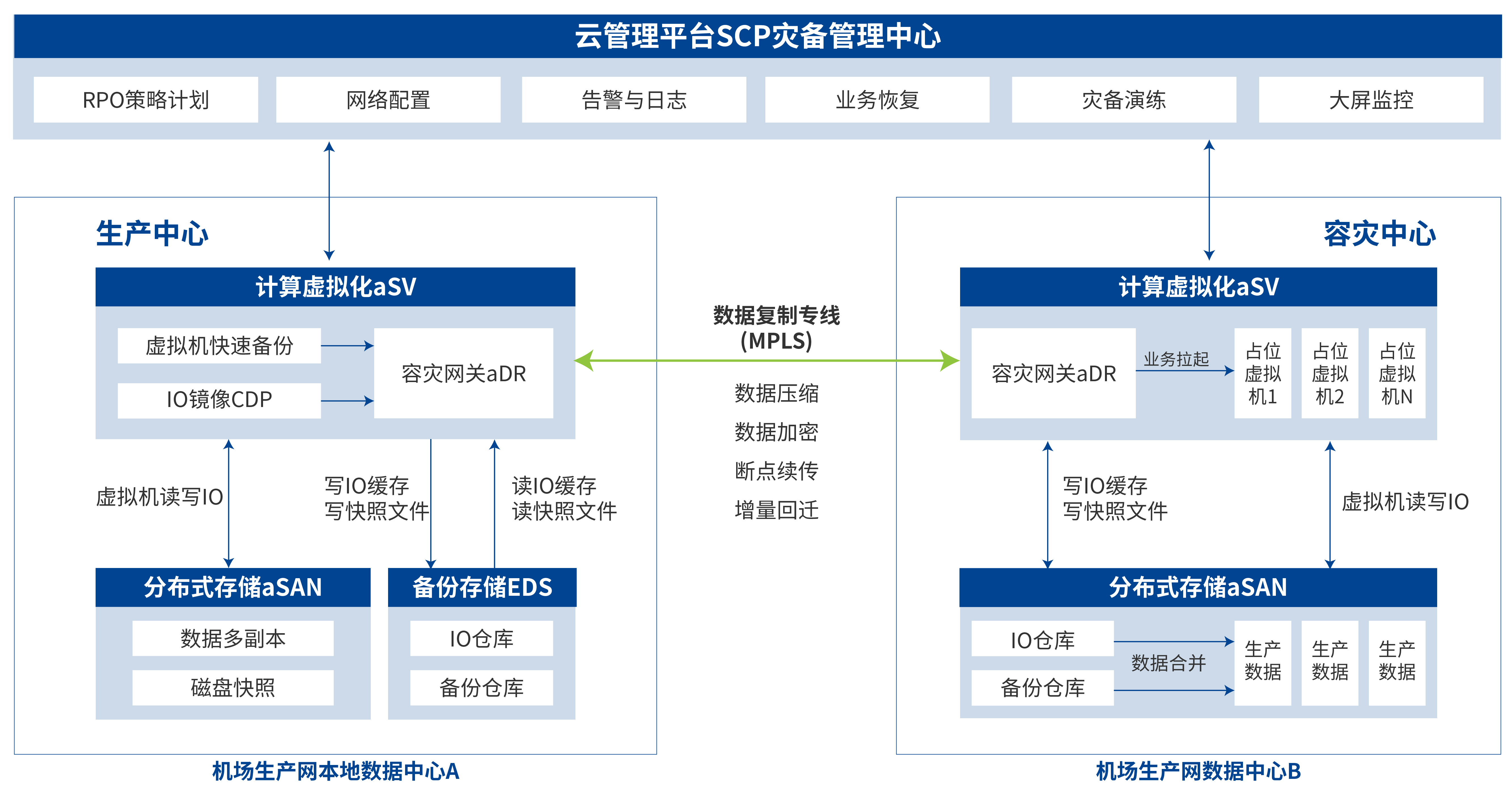 灾备网关根据RPO策略,定期实现IO仓库和快照仓库数据传输至灾备中心,数据传输过程中支持数据加密、数据压缩、断点续传等功能。