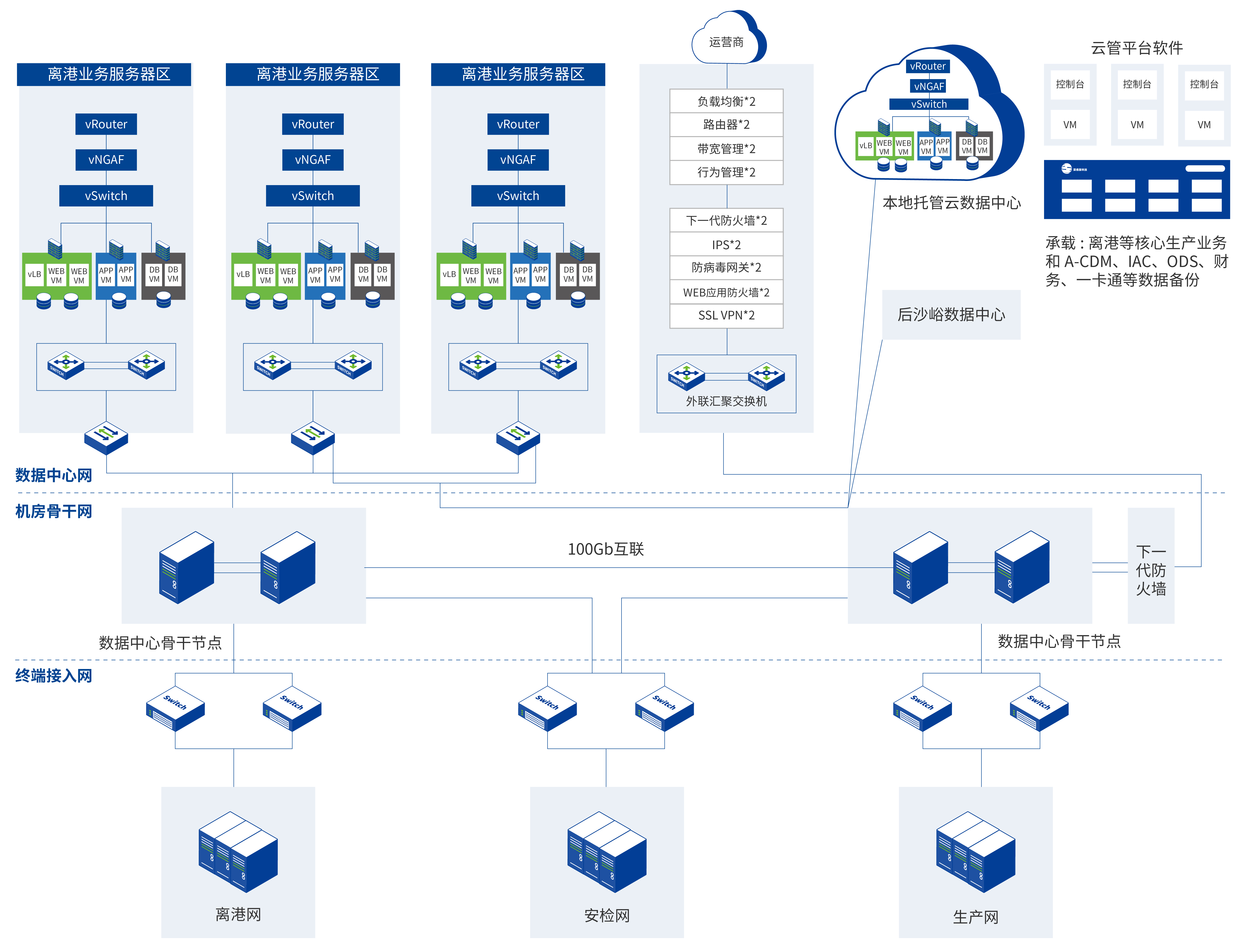 机场生产网等效备份云数据中心灾备建设基础架构平台推荐使用深信服超融合方案,即通过“云管平台 + 超融合架构”实现了资源、业务、数据、灾备的集中承载和统一调度。利用通用的硬件基础架构,搭建好生产和灾备的基础架构,在通用的X86平台之上,利用软件定义的思路,将计算、网络、安全和存储进行全面融合,构建出池化的超融合基础架构。