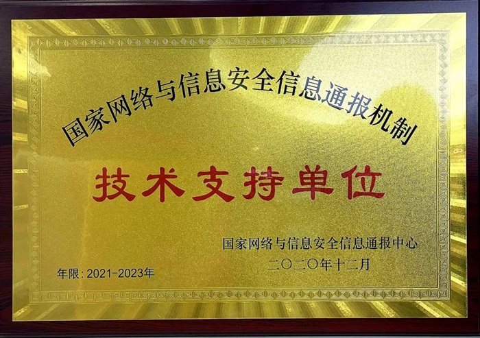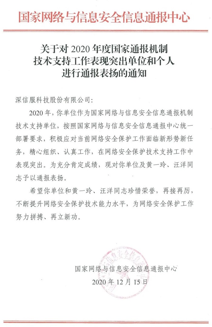 深信服科技股份有限公司凭借在国家重大活动网络安全保卫技术支持工作中的优异表现,获评“国家网络与信息安全信息通报机制2021-2023年技术支持单位”。同时,深信服科技股份有限公司以及深信服员工黄一玲、汪洋受到了国家网络与信息安全信息通报中心的通报表扬,并被评为“2020年度国家通报机制技术支持工作突出表现单位和个人”。