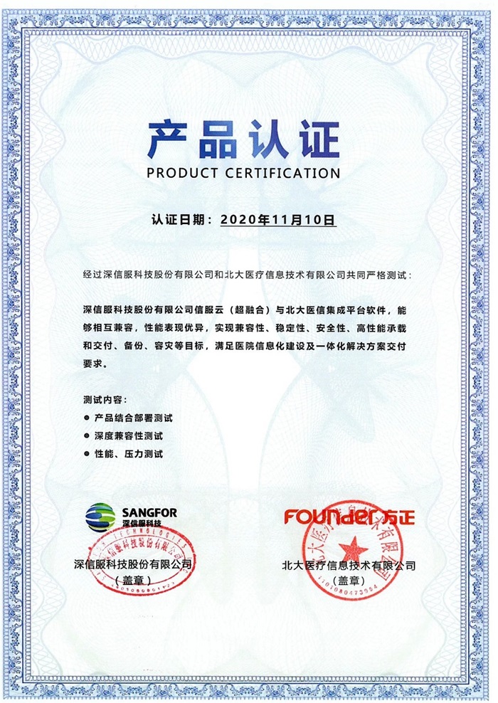 近日,深信服信服云(超融合)与北大医疗信息技术有限公司(北大医信)智慧医院信息平台(集成平台)软件经过严格的实验室测试认证,取得兼容性认证报告。测试表明,结合双方产品形成的一体化解决方案性能表现优异,能够实现兼容性、稳定性、安全性、高性能承载和交付、备份、容灾等目标,为双方合作打开良好局面。