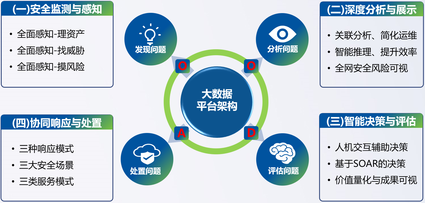整个方案建设具备“安全监测与感知、深度分析与展示、智能决策与评估、协同响应与处置”四维安全闭环能力,这四个维度也是发现、分析、评估、处理问题的过程。